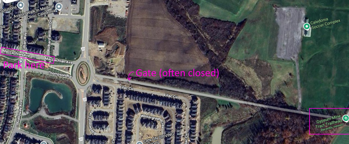 - Park in the residential area nearby (ex: MacLachlan Ave) and bike through the roundabout to Lilac Drive and to the trailhead (see this MAP). This is because the road to the Caledonia Soccer Complex (where parking could be plentiful) has been gated closed since the COVID pandemic. It was still closed as of June 2024. No idea when it will reopen.
